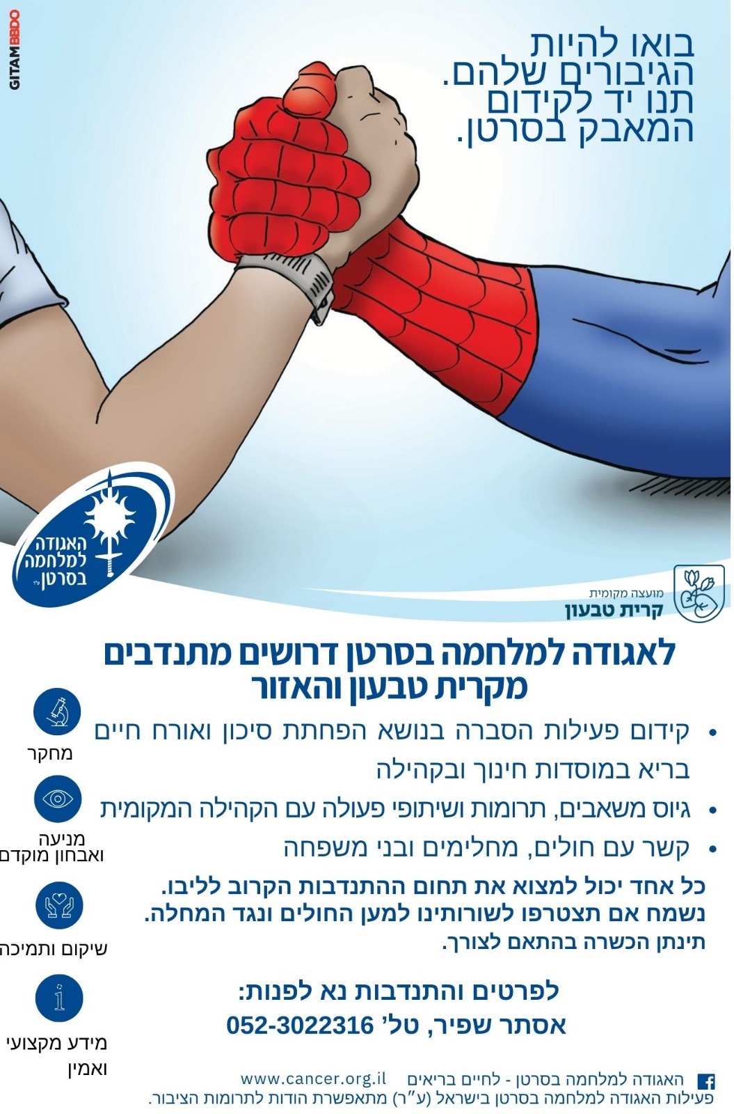 האגודה למלחמה בסרטן בקרית טבעון מחפשת מתנדבים