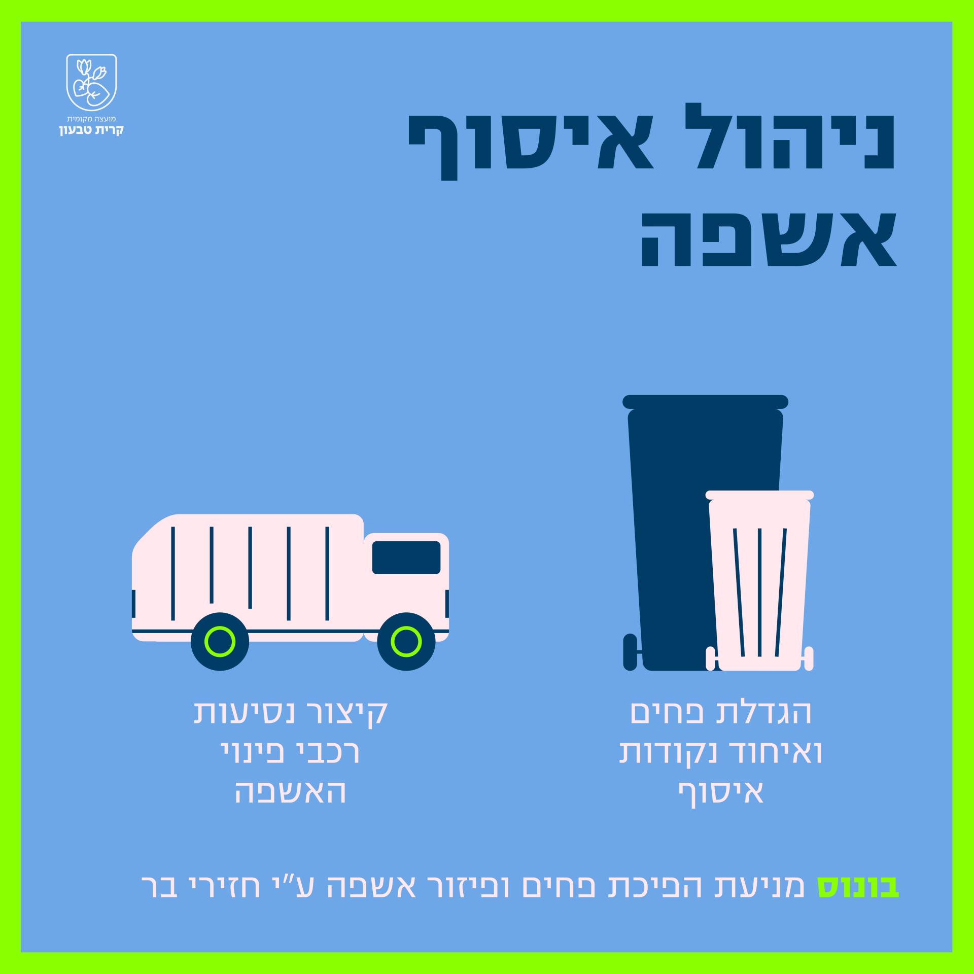 הגדלת נפח הפחים ואיחוד נקודות איסוף מאפשרים צמצום במספר סבבי הפינוי ובהיקף תנועת משאיות האשפה במרכז היישוב. במקביל, התאמת זמני הפינוי לשעות בהן עומסי התנועה נמוכים יותר תורמת לזרימה רציפה ובטוחה יותר עבור כלל משתמשי הדרך.