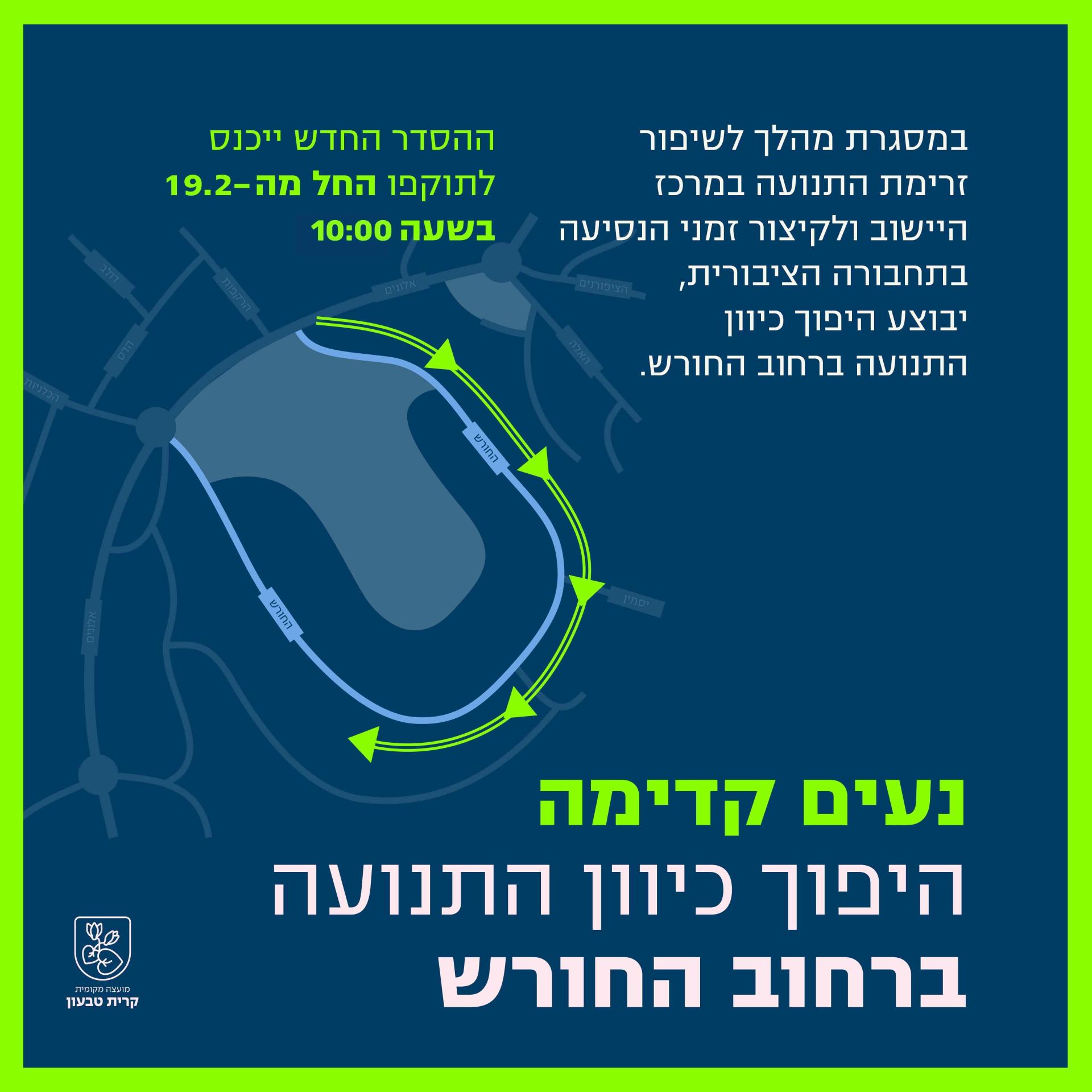 כחלק מהמאמץ לשיפור זרימת התנועה ולהפחתת עומסי התנועה במרכז הקריה, אנו נערכים ליישום הסדר תנועה חדש במרכז טבעון היפוך כיוון התנועה ברחוב החורש.