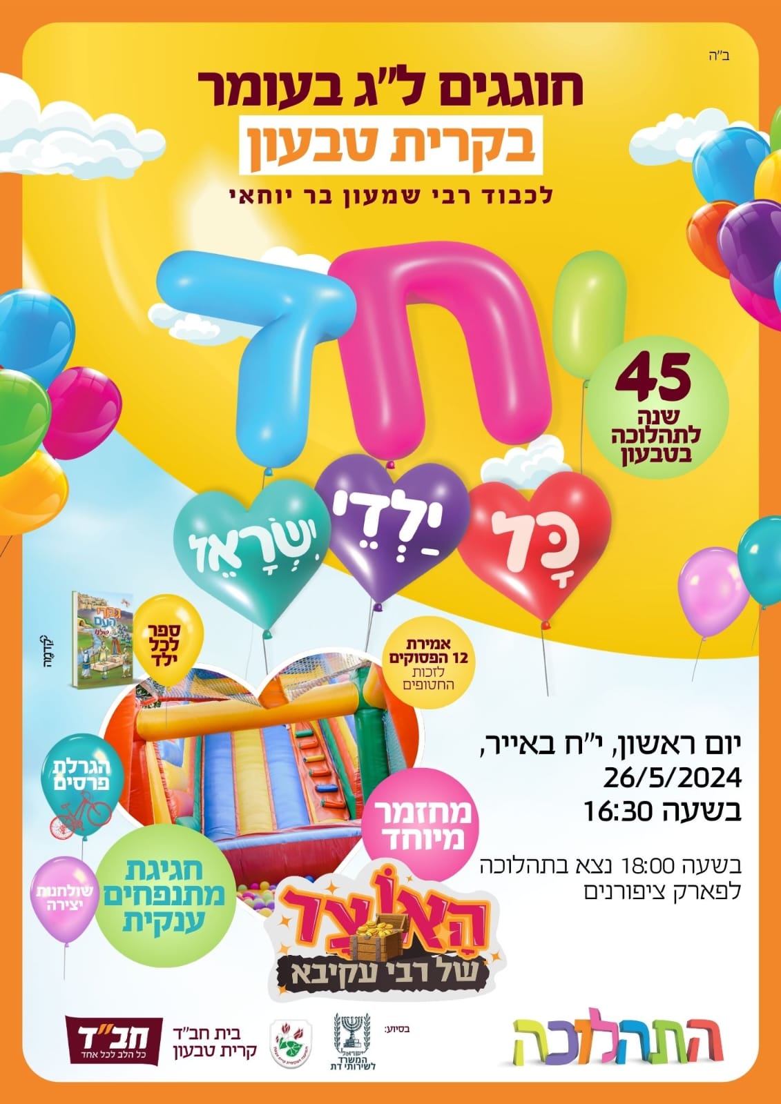 ובראשון בין השעות 17:00-01:00 בפארק הקטר (מיקום מודיק מטה) או בתהלוכה של חב"ד החל מהשעה 18:00 לפארק הציפורנים.