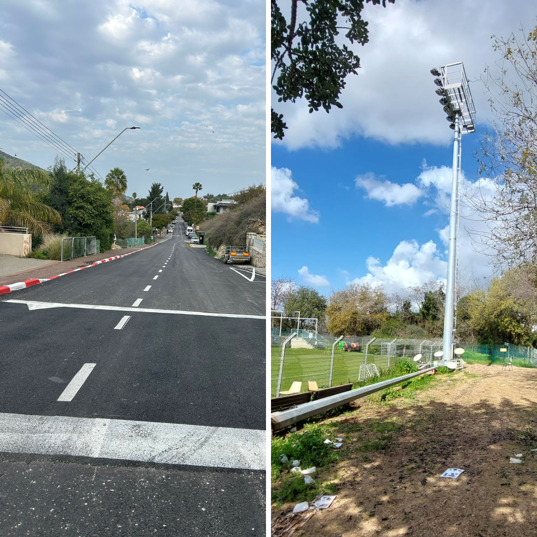 מימין: תאורה חדשה במגרש הספורט, משמאל: שיפוץ הכבישים ברחוב הרצל