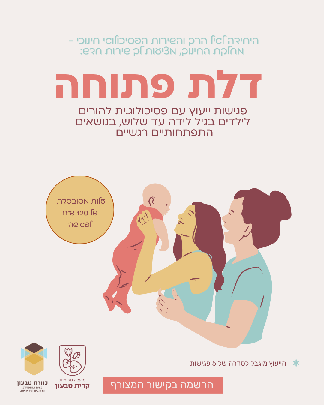 תכנית "דלת פתוחה" מציעה לכם פגישה אישית עם פסיכולוג.ית התפתחותית או חינוכית, שתעניק ליווי מקצועי בנושאים שמעסיקים הורים צעירים, החל משאלות על התפתחות רגשית ומוטורית, דרך בניית הרגלים יומיומיים בריאים ועד התמודדות עם רגעים מאתגרים כמו גבולות, בכי או שינה.