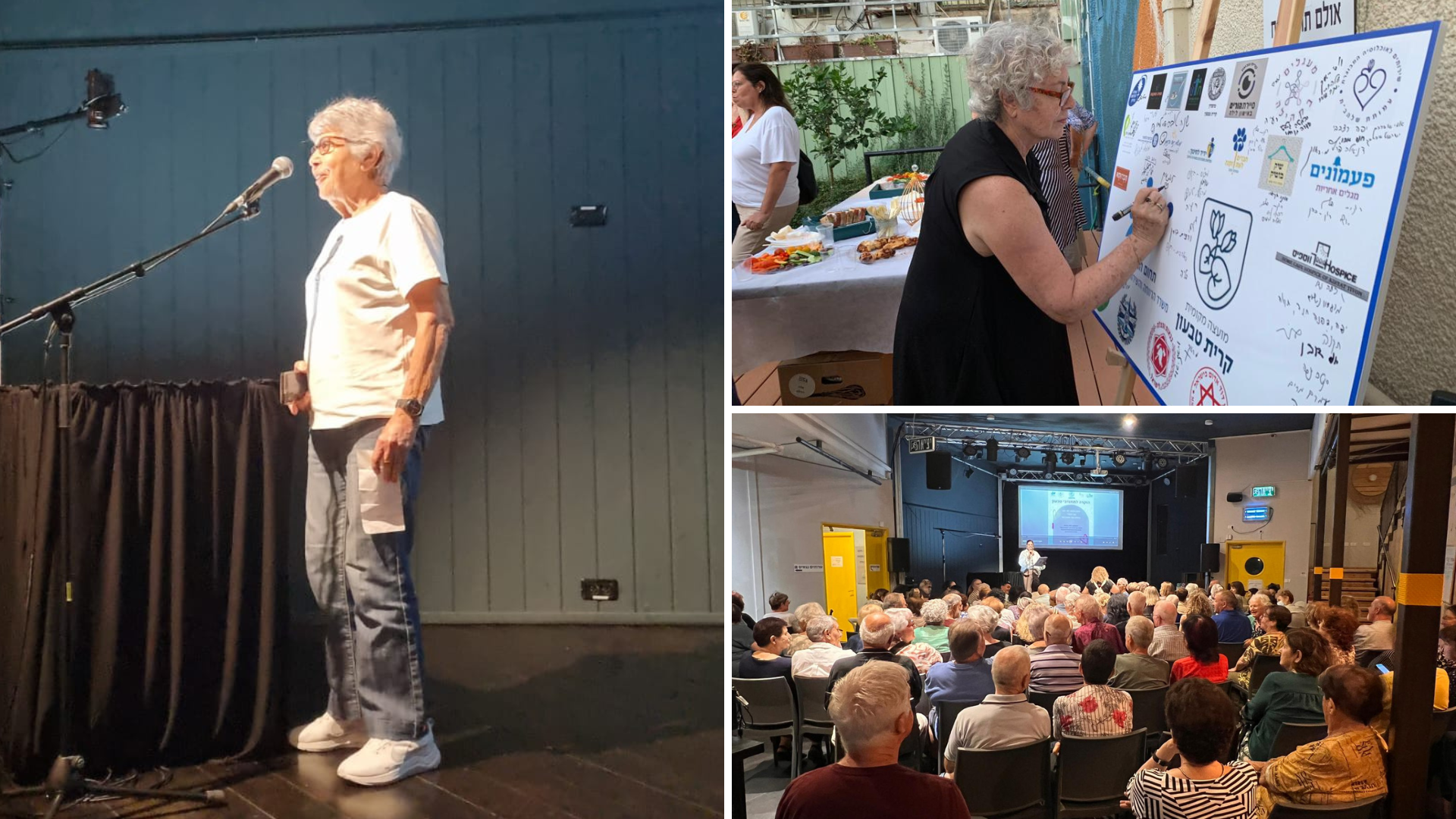 מימין למעלה: אחת המתנדבות חותמת את שמה על לוח השותפים והעמותות, מימין למטה: מארגנת ערב ההוקרה, עו"ס סילביה מרג'יה מברכת את המתנדבים והתנדבות משמאל: הגברת מרים ראוך מברכת