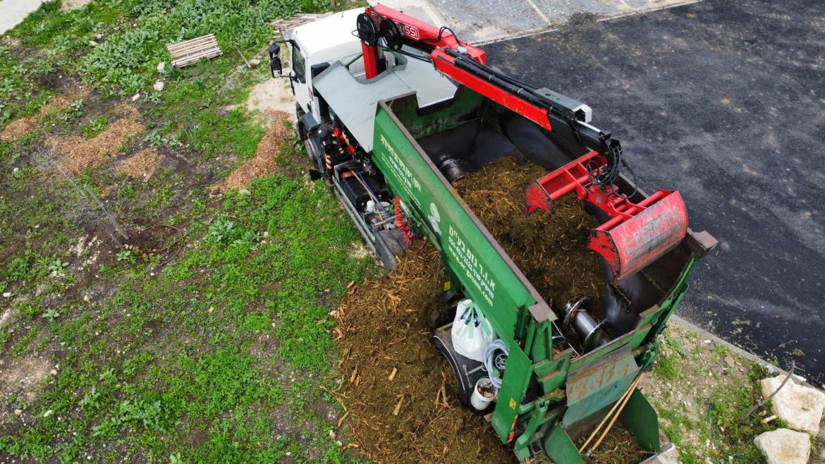 ובכן, מה הבשורה? בימים אלו התחילה לעבוד ביישוב משאית ייחודית אשר יוצרת מעגל סגור ומשלימה את כל הליך הטיפול בגזם בתוך היישוב. המשאית אוספת גזם נקי, מרסקת אותו ומפזרת בתאי גינון, כל זאת בכלי אחד. לפיזור הגזם תועלות נוספות שכן הוא מטייב את הקרקע, מפחית צורך בהשקיה ומונע עשבייה ובכך מפחית ואף מייתר את הצורך בהדברה או בטיפול מכני בתאי הגינון.