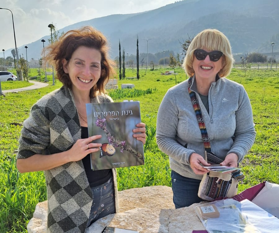 מימין: דליה לביא, משמאל: שני אוסטרייכר מנהלת מחלקת קיימות וסביבה בעת תכנון גינה מושכת פרפרים בשכונת צל אורנים
