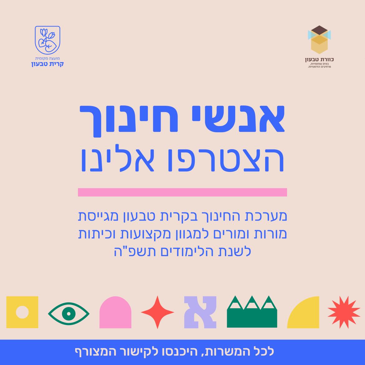למועצה המקומית קרית טבעון דרוש.ה תומך.ת חינוך בגן ילדים מכרז חיצוני 53/2025 בהתאם לסעיף 10 לצו המועצות המקומיות (נוהל קבלת עובדים לעבודה), תשל"ז – 1976 נמסרת בזה הודעה על משרה פנויה. תואר המשרה: תומך.ת חינוך בגן ילדים היקף המשרה: 30% אחוזי משרה (12 שעות שבועיות) תנאי העסקה: בהתאם לנתונים האישיים ולהסכם הקיבוצי של תומכות חינוך כפיפות: מקצועית וארגונית למנהל הגן, כפיפות מנהלתית למנהלת מחלקת גני ילדים במועצה. תיאור התפקיד: טיפול בילדי הגן, תוך מילוי משימות ארגוניות ופדגוגיות בהנחיית מנהל הגן וכן בכפוף לתכנית עבודת הגן ולמדיניות הרשות המקומית ומשרד החינוך.