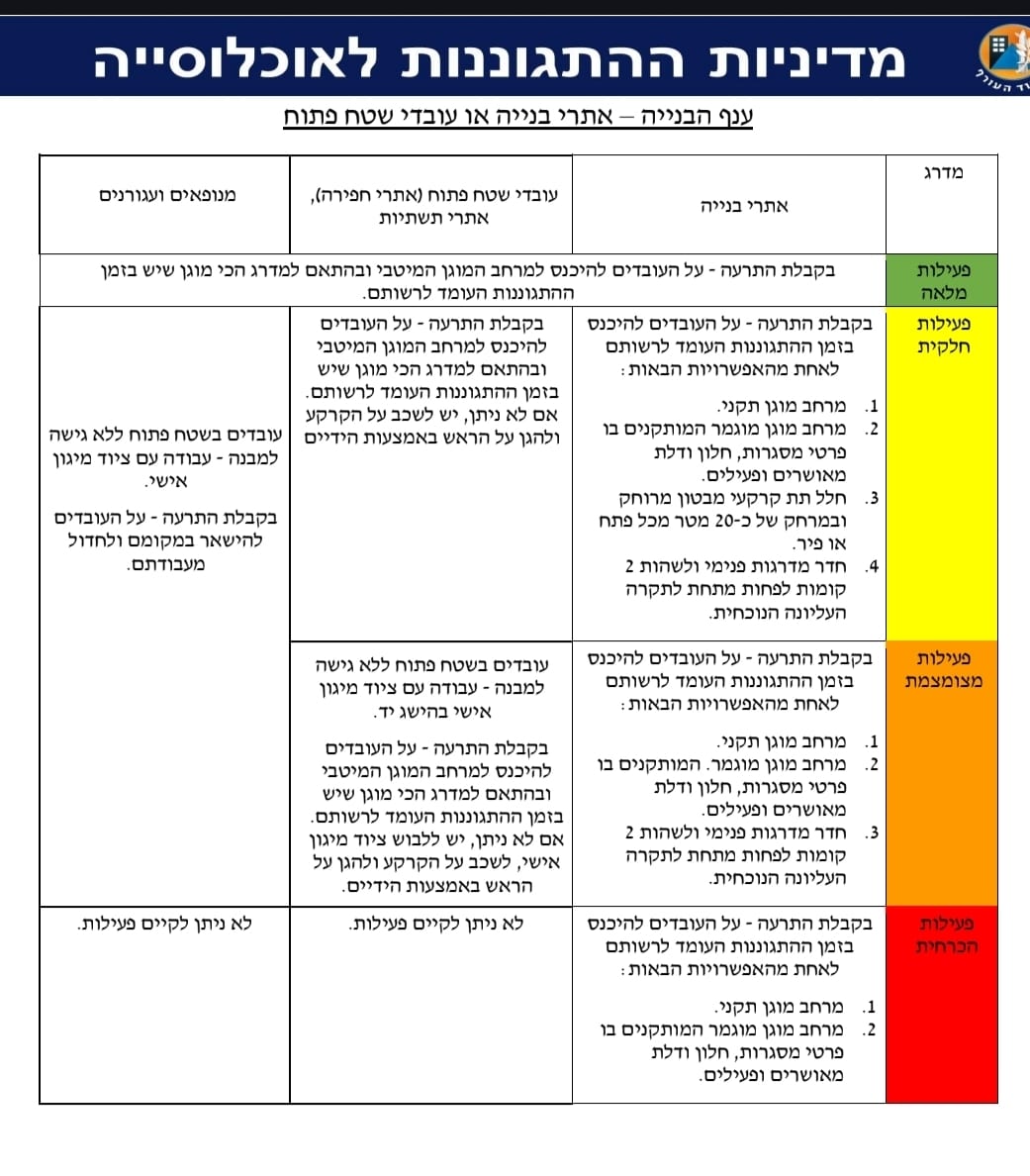 - מצורפת טבלת מדיניות התגוננות לאוכלוסייה של פיקוד העורף